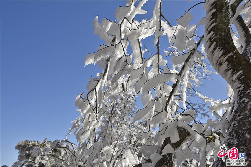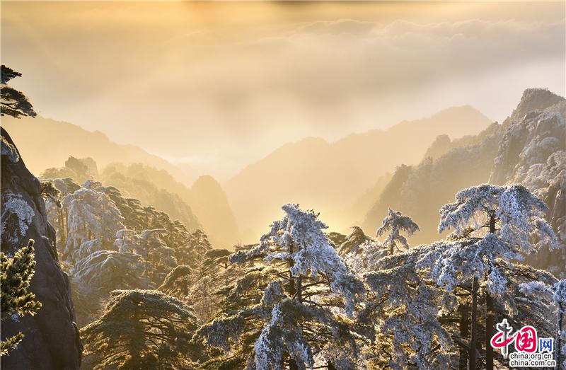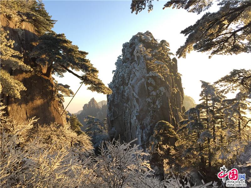 2019年最后一天黃山風景區(qū),出現(xiàn)壯觀的日出、霧凇、云海景觀,到處銀妝素裹,冰雕玉砌,“一夜寒風起,萬樹銀花開”,置身其間,仿佛進入撲朔迷離的童話世界,給來山的游客帶來意外的驚喜。