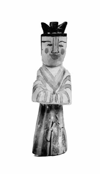 這個(gè)木俑,打扮著一副明星相:她雙手執(zhí)禮,頭發(fā)結(jié)為三環(huán)髻。工匠們只是簡(jiǎn)單地雕刻出了木俑的大體形狀。然后用墨線勾勒出了眉、眼、鼻,用紅色裝飾出鼻梁、嘴唇、臉頰;又用紅黑兩色繪制出衣服。