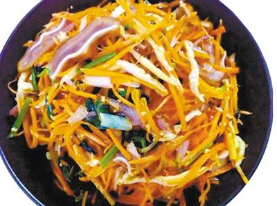 ● 做法:以地產(chǎn)蔬菜胡蘿卜、菠菜和綠豆芽,搭配耳絲、口條、肝片而成,色澤明快、微酸適口:胡蘿卜絲用少許鹽腌至脆柔、綠豆芽焯水保持白嫩、綠菠菜焯過(guò)捏去水分切成寸段,這三樣食材搭配營(yíng)養(yǎng)成分暫且不說(shuō),單就紅、白、綠三色,就足夠醒目了。正宗的天水酒碟還要配以鹵豬耳、豬肝和煮熟的拆骨肉,最后點(diǎn)綴以綠綠的香草。