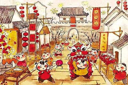 轉(zhuǎn)眼到了大年三十,俗稱“除夕”,黑河流域除舊迎新的主要活動,都集中在這一天進行。父親一大早就帶我們揭去墻上的舊畫,貼上新買的年畫;窗戶蒙上新紙,貼上母親親手剪的窗花。母親勤勞淳樸心靈手巧,剪出的窗花有“孫猴子摘桃”“孔雀嬉牡丹”,特別是小豬、小狗、小老虎圖案,栩栩如生活靈活現(xiàn)。做完這一切,已經(jīng)到了晌午時分,父親便急急忙忙帶我們貼春聯(lián)、貼門神。父親說門神是守護門庭的衛(wèi)士,左邊貼“白臉兒”,右邊貼“黑臉兒”,象征財源廣進家道平安。我們將一副秦瓊和尉遲恭的門神,端端正正貼上莊門扇,滿院子紅紅的對聯(lián),滿屋子嶄新的年畫和窗戶上鮮艷的窗花,為節(jié)日披上了盛裝,喜氣洋洋。