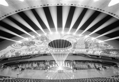 華夏文化展示中心分為展演區(qū)與展示區(qū)兩個(gè)部分,展示區(qū)為古鎮(zhèn)式商業(yè)街,目前已進(jìn)入收尾階段,展演區(qū)為大型激光水舞秀劇場(chǎng)——日月館,去年已試運(yùn)營(yíng),效果極佳。別名“黃河巨蛋”的日月館總用地面積為12000平方米,場(chǎng)館外形呈半橢圓形,由兩片獨(dú)立的頂棚覆蓋,場(chǎng)館高30米,寬約80米,內(nèi)設(shè)觀眾席位1450座。場(chǎng)館屋頂?shù)奶煅坶_(kāi)口和場(chǎng)館地面體現(xiàn)了中國(guó)天圓地方的理念以及太陽(yáng)和月亮的互相映襯。外立面采用了與當(dāng)?shù)貍鹘y(tǒng)屋頂瓦片相呼應(yīng)的獨(dú)特形狀,又像鳥(niǎo)兒折疊的翅膀和羽毛,極富活力和寓意。