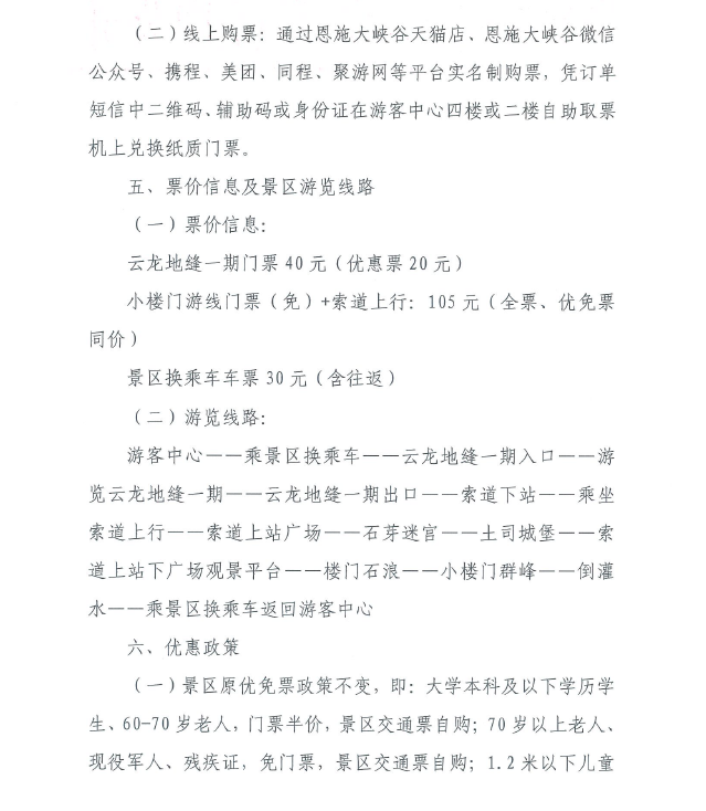 優(yōu)惠政策方面,景區(qū)原優(yōu)免票政策不變;與此同時,全國醫(yī)護(hù)人員、援鄂醫(yī)療隊員、天津援助恩施醫(yī)療隊員按湖北省文旅廳、恩施市文旅局相關(guān)優(yōu)惠政策(憑有效證件)免門票;天津市民憑有效證件享受門票半價。