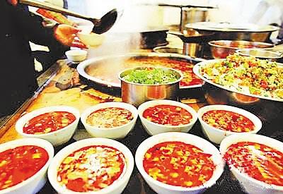 在晾面的時(shí)候,主婦開始炒菜,做湯頭。做菜前,先要熟些新鮮的油潑辣子,在辣面中調(diào)入少許精鹽與調(diào)和粉,將熱好的胡麻油“嗞拉”一聲傾入辣子面中,香辣之味頓時(shí)充滿一室。然后開始燴菜做湯頭。只見主婦有條不紊地將切好的菜丁逐一擱進(jìn)油鍋里,反復(fù)翻炒,適時(shí)放入大香、桂皮、草果、生姜、花椒等制成的混合調(diào)料與精鹽,等香味炒出來了,便漩入提前燒好的開水,火關(guān)小,讓其慢熟。