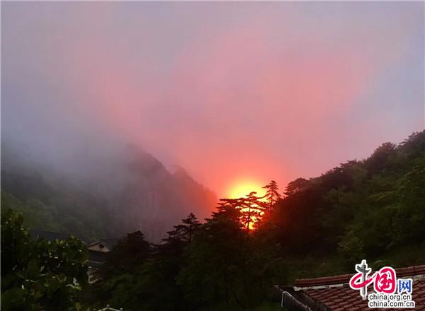 每逢五月,杜鵑花如約而至,用思慮了一冬的巧思把黃山的每一個角落都裝扮一新,給連綿不絕的山崗披上了五彩的織錦。經(jīng)過了一冬的蟄伏和等待,杜鵑鉚足了勁兒,花團錦簇的熱情如“燃”起的火把,紅透了半邊天。黛青色的遠山縹緲幽遠,參天的松柏枝繁葉茂,淡而薄的云霧似有還無,杜鵑的姹紫嫣紅給黃山這幅意蘊悠長的水墨畫增添了幾分濃墨重彩,黃山更加靈動秀美了。最壯觀的當屬日出日落時分了,天邊的紅霞好似在花枝間流連,墜入花叢般和散落一地的杜鵑相互輝映、渾然一體。