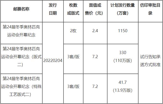 《第24屆冬季奧林匹克運(yùn)動(dòng)會(huì)開(kāi)幕紀(jì)念》紀(jì)念郵票計(jì)劃發(fā)行數(shù)量公布