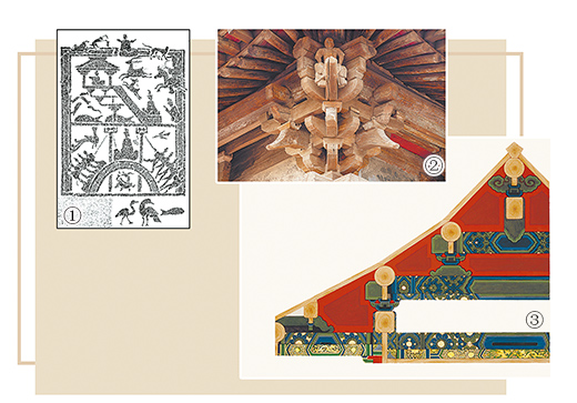圖①:漢代畫(huà)像磚(石)上的高架建筑。 圖②:山西雙林寺大殿斗拱。 圖③:故宮建筑上的旋子彩畫(huà)小樣。