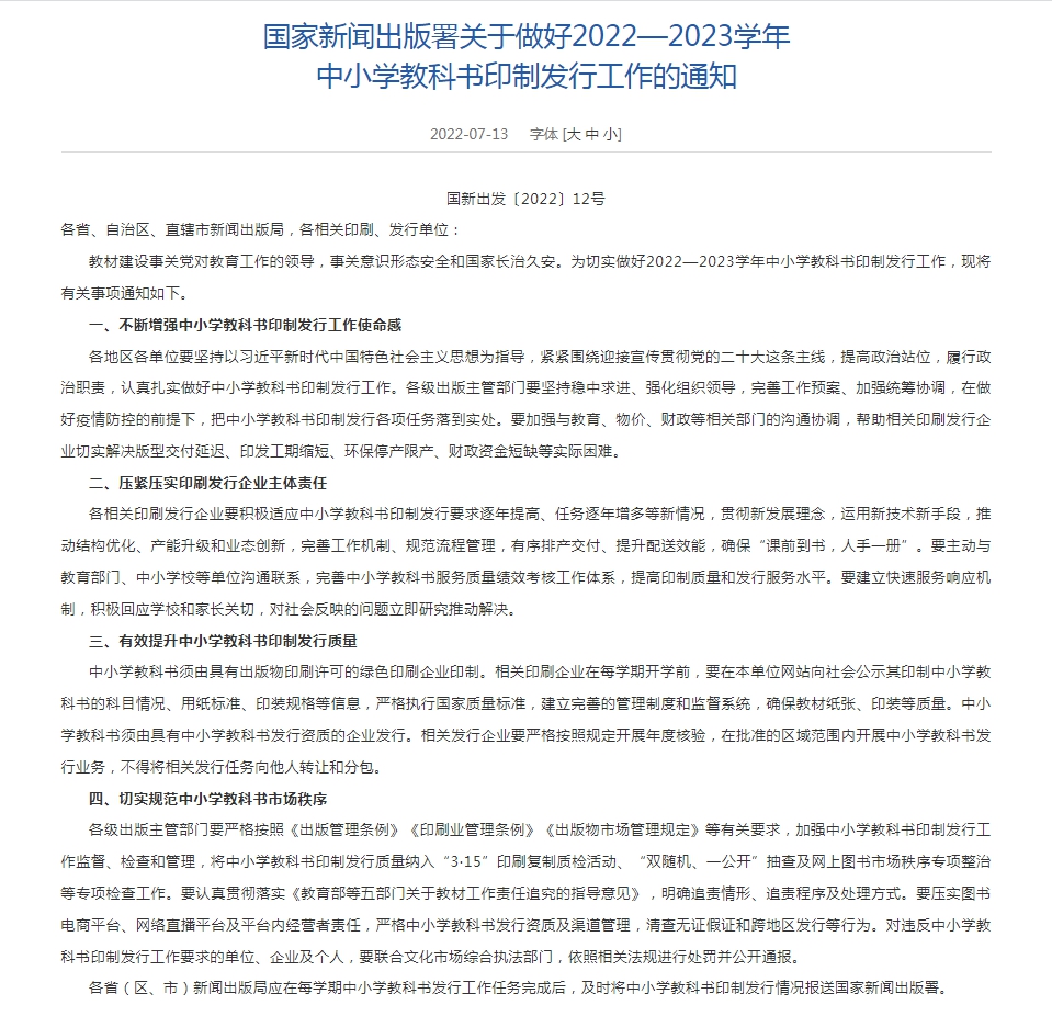 針對中小學教科書印制發(fā)行等環(huán)節(jié),《通知》中表示要有效提升中小學教科書印制發(fā)行質量。