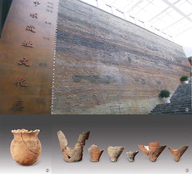 重慶中壩遺址出土的地層文物,完整包含了新石器時代晚期、夏商周、秦漢、魏晉南北朝、唐宋元明清不同時代的所有地層,可以讓人們直觀感受到中華五千多年文明綿延不絕的偉大與震撼。圖1為中壩遺址剖面還原圖(圖片來源:重慶市忠縣縣委宣傳部)。圖2、圖3分別為中壩遺址出土的制鹽陶器花邊口圜底罐、花邊口尖底缸底(圖片來源:科學出版社)。