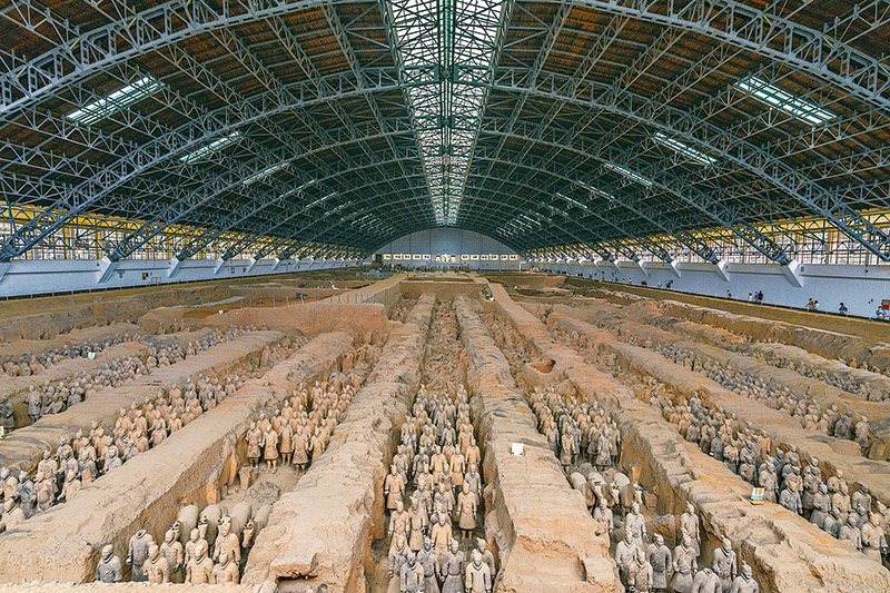 秦始皇陵是中國歷史上第一個多民族的中央集權國家的皇帝秦始皇于公元前246年至公元前208年營建的。作為秦始皇陵陪葬墓坑之一的兵馬俑坑于1974年被發(fā)現(xiàn),被譽為“世界第八大奇跡”。圖為秦始皇兵馬俑博物館一號坑全景?!∪嗣駡D片 丁俊豪/攝