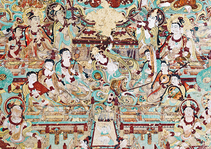 敦煌文化延續(xù)近兩千年,是世界現(xiàn)存規(guī)模最大、延續(xù)時間最長、內(nèi)容最豐富、保存最完整的藝術寶庫,是世界文明長河中的一顆璀璨明珠,也是研究我國古代各民族政治、經(jīng)濟、軍事、文化、藝術的珍貴史料。圖為莫高窟第112窟南壁壁畫“反彈琵琶樂舞圖”。 敦煌研究院供圖
