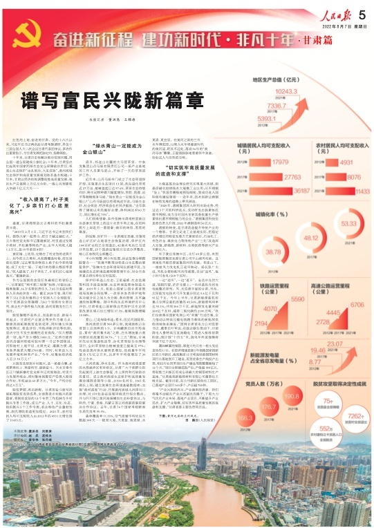 8月7日,人民日報(bào)刊發(fā)“奮進(jìn)新征程 建功新時代·非凡十年”甘肅篇,重磅推出兩塊整版,聚焦黨的十八大以來,隴原兒女牢記習(xí)近平總書記的殷切囑托,踔厲奮發(fā)、銳意進(jìn)取,埋頭苦干、勇毅前行,加快建設(shè)幸福美好新甘肅,不斷開創(chuàng)富民興隴新局面。