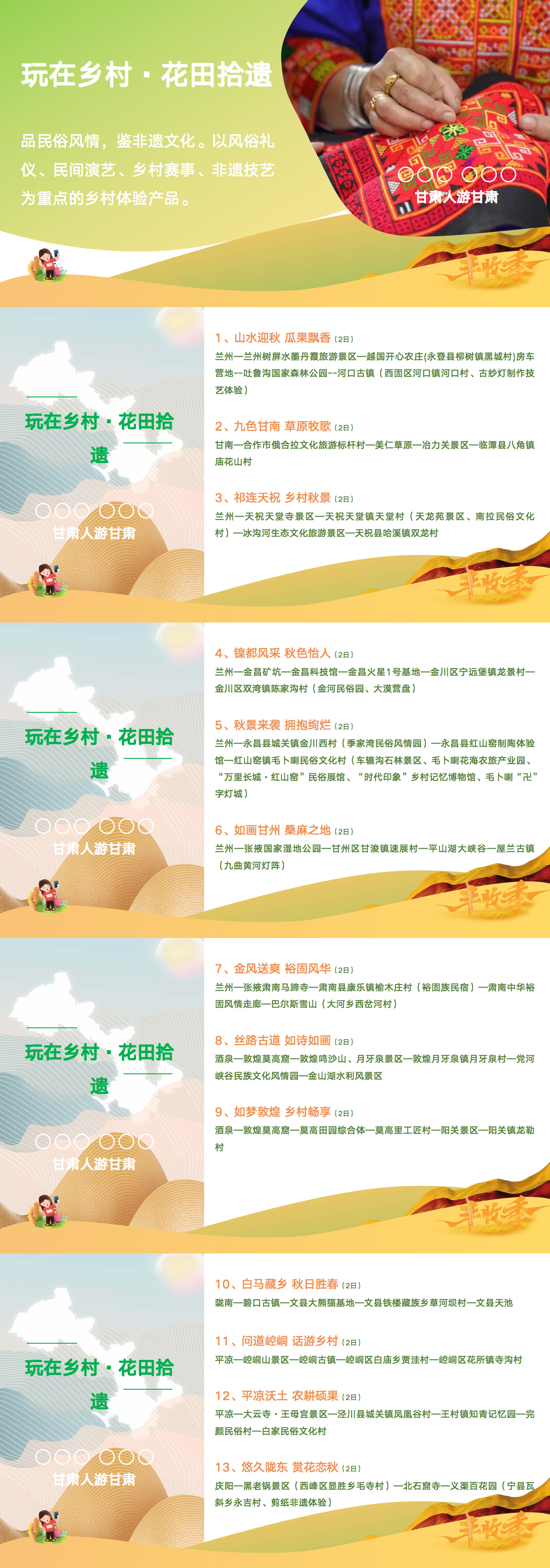 這5大類線路具體包括:游在鄉(xiāng)村·豐收節(jié)慶、玩在鄉(xiāng)村·花田拾遺、悟在鄉(xiāng)村·鄉(xiāng)土新知、品在鄉(xiāng)村·康養(yǎng)鄉(xiāng)居、賞在鄉(xiāng)村·臻味清歡,涵蓋了鄉(xiāng)村觀光、美食、住宿、游玩、體驗、研學、康養(yǎng)等內(nèi)容,為金秋時節(jié)游客出行提供豐富的選擇,也為甘肅文旅市場聚人氣、促消費提供了重要載體。