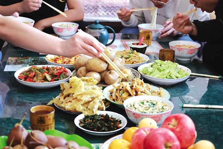 金萬裕今年77歲,留著山羊須,筋骨強(qiáng)健,精神矍鑠。他家有21畝地,洋芋今年就種了10畝。當(dāng)天,是他家挖洋芋的第二天,孫子挖,金萬裕撿。這里的紅洋芋,淀粉含量高,秧有半人之高。臨近中午,金萬裕邀記者回家吃洋芋。在寬敞透亮的新房子里做客,喜悅的氣氛和一桌洋芋宴足以讓人解饞、解乏,尤其是“破皮襖”(油壺喧)就洋芋菜,簡直是一絕。種植一直是金家的一份可觀收入,洋芋、大豆都是盼頭,如今房子住套院,孫子在開塔吊,三代人和諧幸福。