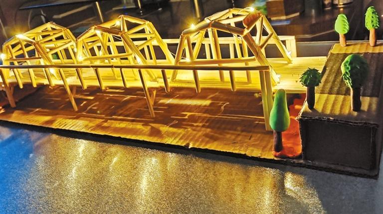 “平時去看中山橋只覺得它很美,現(xiàn)在覺得當時建造它一定很不容易。”馬靜怡同學和媽媽用一次性筷子制作的中山橋模型,與實物外觀頗為相似,為了呈現(xiàn)中山橋拱形鋼架的效果,馬靜怡裁筷子再拼粘費了一番工夫。大橋模型制作好了,她對中山橋也有了更深的認識。