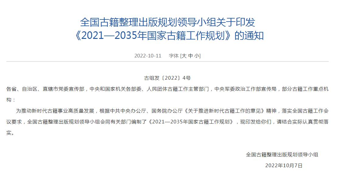 12日,據(jù)國(guó)家新聞出版署網(wǎng)站消息,全國(guó)古籍整理出版規(guī)劃領(lǐng)導(dǎo)小組會(huì)同有關(guān)部門(mén)編制了《2021—2035年國(guó)家古籍工作規(guī)劃》,其中提到,至2035年,古籍工作體制機(jī)制更加完善,以重大工程為引領(lǐng),加強(qiáng)古籍工作全局性謀劃,重點(diǎn)實(shí)施 《永樂(lè)大典》、敦煌文獻(xiàn)系統(tǒng)性保護(hù)整理出版工程等。
