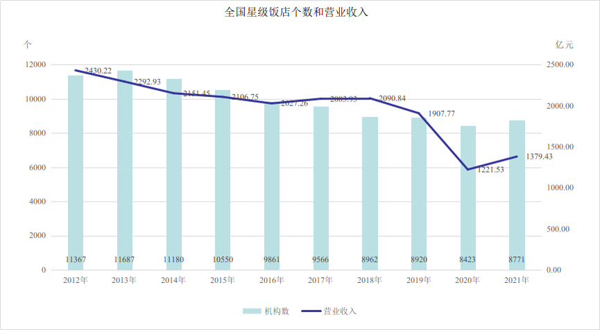數(shù)據(jù)顯示,截至2021年,全國星級飯店總數(shù)達到8771個,營業(yè)收入達到1379.43億元。
