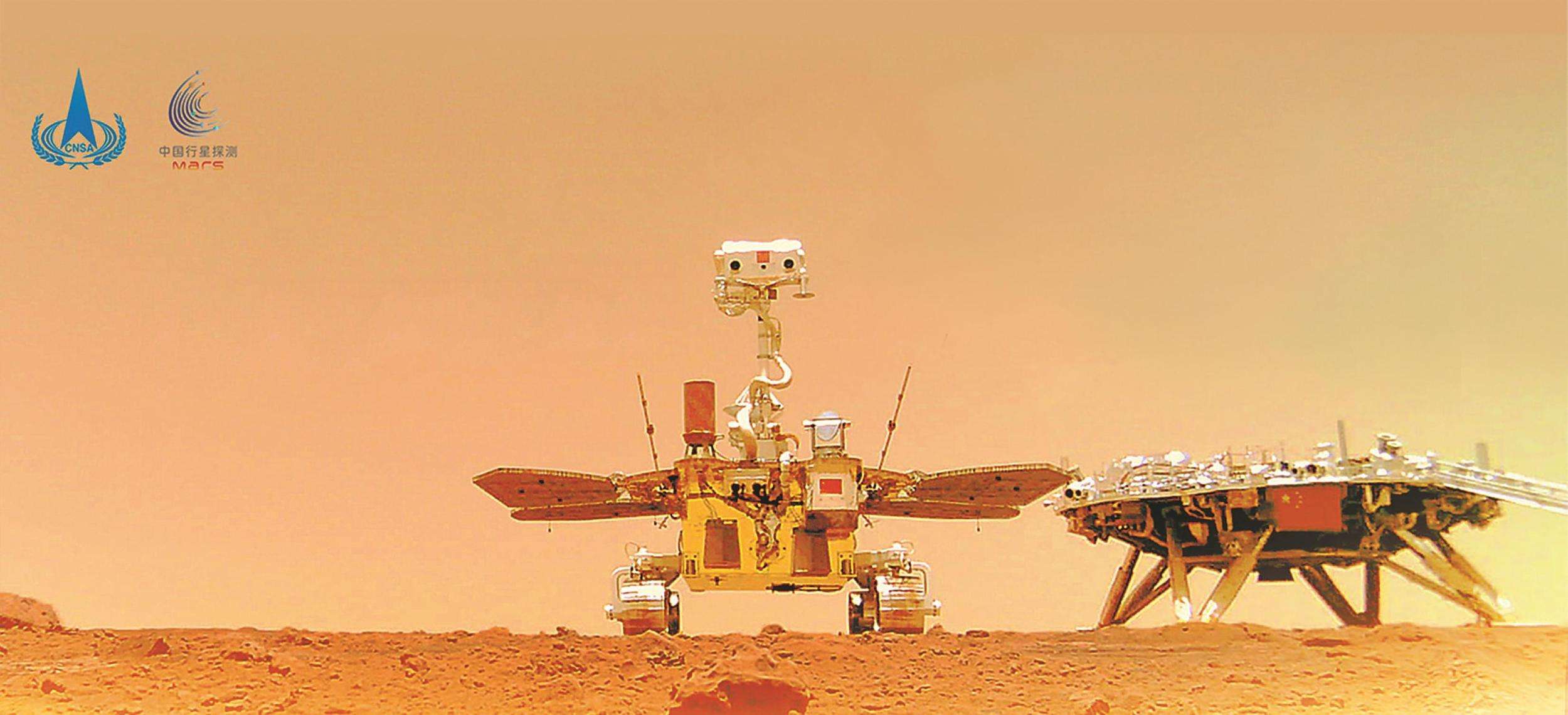中國首次火星探測天問一號任務“祝融號”火星車與著陸器合影。國家航天局供圖