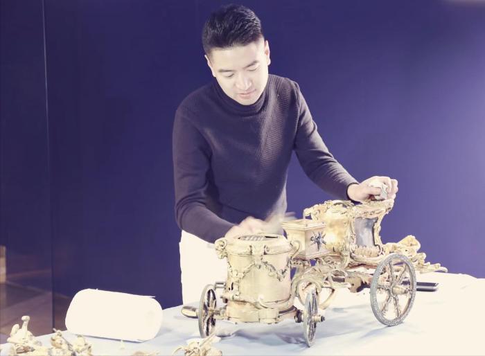 “這件‘魔術(shù)人鐘’功能比較復(fù)雜,經(jīng)過長期開動后,出現(xiàn)了一點(diǎn)故障,就存放在了庫房。”亓昊楠說,自己和師父王津一起修復(fù)這座鐘表時,才發(fā)現(xiàn)它的內(nèi)部系統(tǒng)有多精細(xì)。