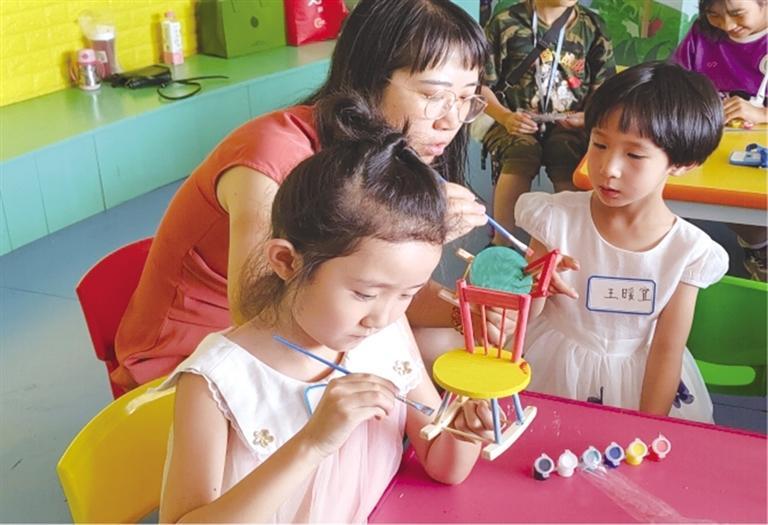 為了讓孩子們切身體驗(yàn)魯班的精湛技藝,在手工制作環(huán)節(jié),大家進(jìn)行了榫卯結(jié)構(gòu)的椅子模型拼裝。在主持人的帶領(lǐng)指導(dǎo)下,孩子們將椅背、椅腿按照凹槽精準(zhǔn)嵌入,并為其染上五彩底色、繪制精美圖案,一個(gè)個(gè)“小工匠們”便歡天喜地地完成了自己的手工作品。