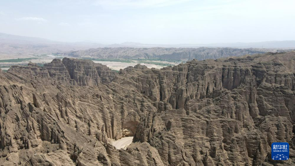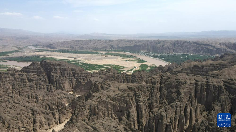 這是位于甘肅省白銀市景泰縣中泉鎮(zhèn)龍灣村的黃河石林景觀(guān)。黃河石林千峰競(jìng)奇、峽谷蜿蜒,與黃河遙相呼應(yīng),形成山環(huán)水轉(zhuǎn)、動(dòng)靜結(jié)合的自然奇觀(guān)(7月11日攝,無(wú)人機(jī)照片)。新華社記者 張可任 攝