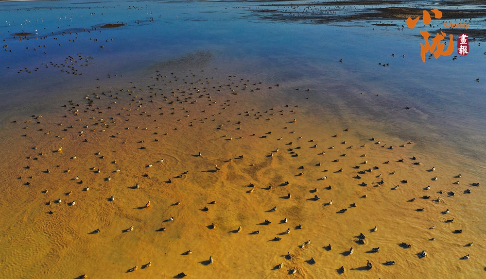 秋風(fēng)輕柔,成群結(jié)隊的候鳥在水面上自游穿梭、追逐嬉戲,與藍(lán)天、湖水、蘆葦、胡楊、沙漠構(gòu)成了一幅美麗和諧的生態(tài)畫卷,盡顯一片生機(jī)勃勃。