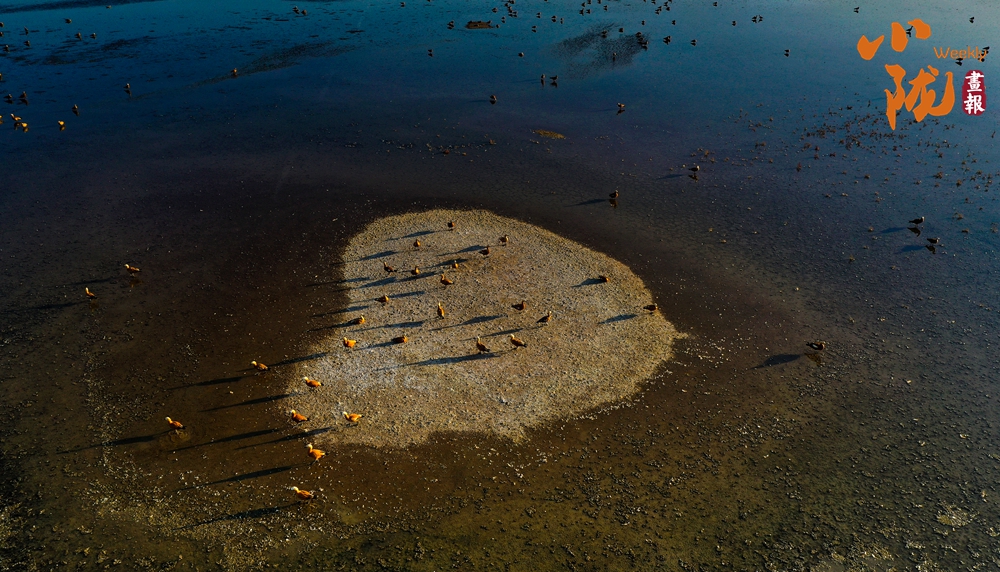 陽光照射下,鹽沼像是一片白色的海洋,湖面波光粼粼。成千上萬只赤麻鴨,在這里停歇覓食,它們或在水中嬉戲打鬧,或在空中振翅飛翔,繪成了一幅秋日美景。