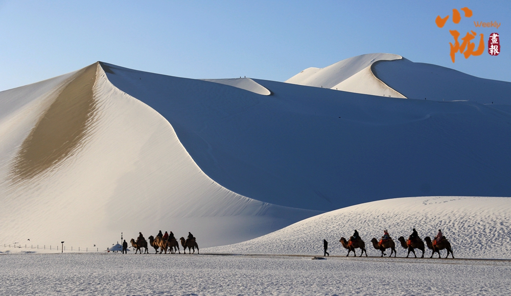 鳴沙山上,連綿不絕的沙海披上銀裝,放眼望去,如詩(shī)如畫(huà),美不勝收,吸引了不少游客騎著駱駝踏雪賞景。