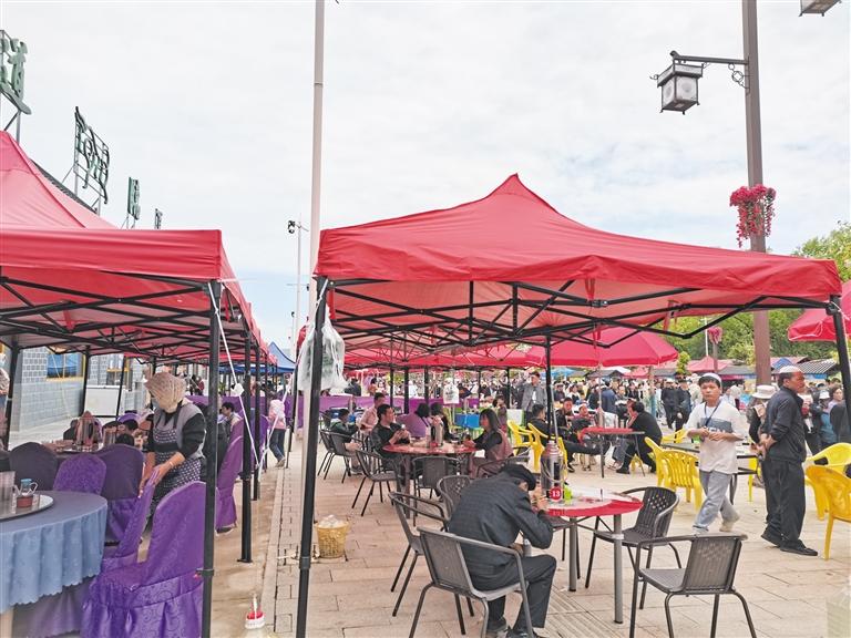 每一個(gè)攤點(diǎn)前,坐滿(mǎn)了游客,他們吃著手抓羊肉、釀皮等特色美食,看著花兒會(huì)文藝演出,好不愜意。