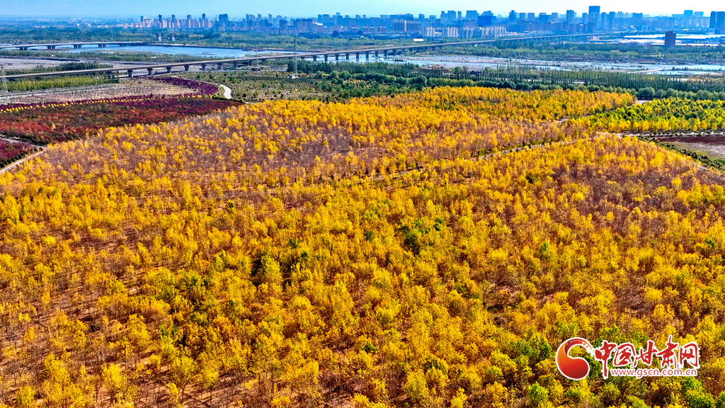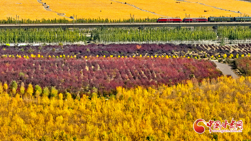 金秋時(shí)節(jié),張掖市甘州區(qū)的黑河兩岸,生態(tài)防護(hù)林的樹葉逐漸披上金色與紅色,景色迷人。尤其是那延綿的人工胡楊林景區(qū),金黃一片,層巒疊嶂,美不勝收。蘭新高鐵與連霍高速穿梭于這片林海之中,構(gòu)成了一幅動(dòng)人的風(fēng)景線。這里的空氣純凈、環(huán)境寧靜、負(fù)氧離子含量豐富,成為了游客和市民休閑觀光的理想之地。
