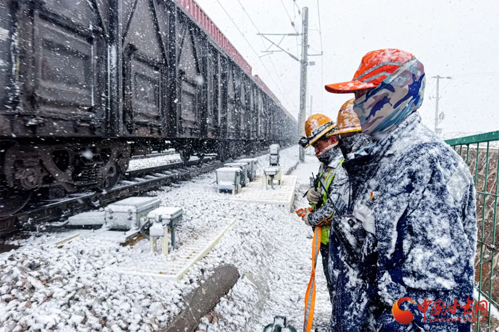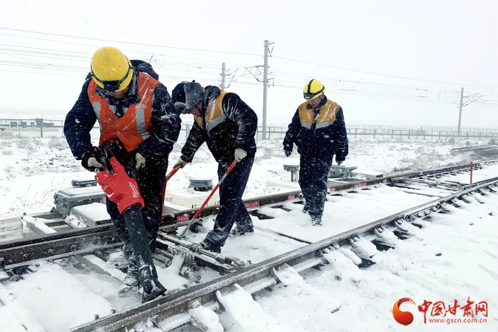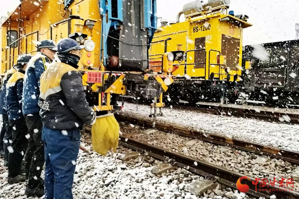 近日,受冷空氣影響,甘肅省古浪、山丹、永昌等地迎來降雪天氣。蘭州鐵路局各單位迅速啟動應(yīng)急預(yù)案,上下聯(lián)動、多措并舉迎戰(zhàn)風雪,保障降雪天氣下運輸安全暢通。(蘭州鐵路局供圖)