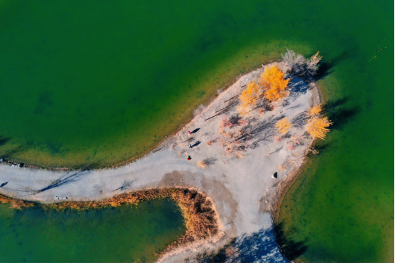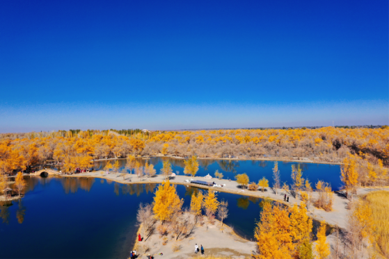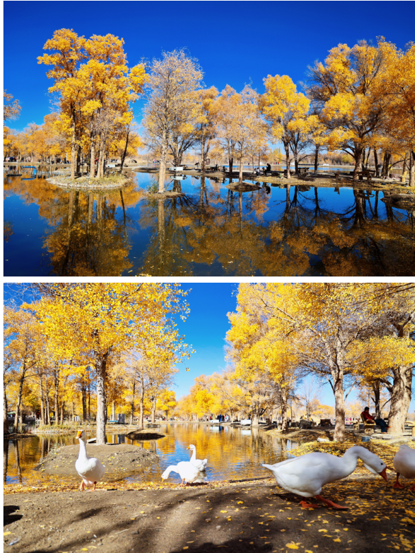 金波湖是金塔胡楊林的心臟,是臨水胡楊的最佳拍攝地之一。湖面倒映著胡楊高大的身影,多姿的樹干,黃色的樹葉,都毫不保留地在水中展示出來。小橋流水、碧波蕩漾、白鵝嬉戲,若不是周邊金黃色的胡楊提醒,會(huì)讓人誤以為來到了江南水鄉(xiāng)。