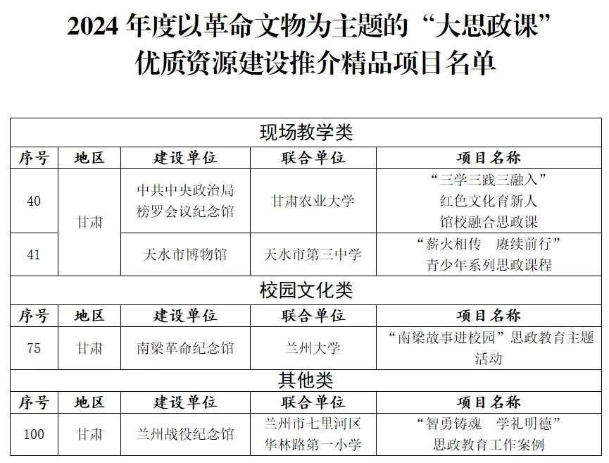 其中,甘肅省4項(xiàng)案例入選。分別是,中共中央政治局榜羅鎮(zhèn)會(huì)議紀(jì)念館、甘肅農(nóng)業(yè)大學(xué)“三學(xué)三踐三融入”紅色文化育新人館校融合思政課;天水市博物館、天水市第三中學(xué)“薪火相傳 賡續(xù)前行”青少年系列思政課程;南梁革命紀(jì)念館、蘭州大學(xué)“南梁故事進(jìn)校園”思政教育主題活動(dòng);蘭州戰(zhàn)役紀(jì)念館、蘭州市七里河區(qū)華林路第一小學(xué)“智勇鑄魂 學(xué)禮明德”思政教育工作案例。