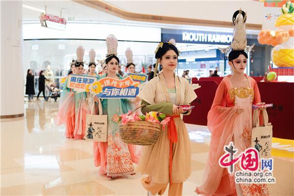 《只此周莊》劇目女主“桃兮”身著華麗的宮廷霓裳,攜宮廷舞姬、樂姬等進(jìn)行了一場(chǎng)別開生面的互動(dòng)巡游。“宇航員”“俠客”、明朝富商“沈萬(wàn)三”等劇中人物走出劇場(chǎng),與市民合照;宮廷器樂演繹、“入畫”舞蹈、英雄出征等節(jié)目從劇場(chǎng)演到商場(chǎng),將宋代的繁華展現(xiàn)得淋漓盡致,市民們沉浸觀演,享受跨時(shí)空的文化盛宴。