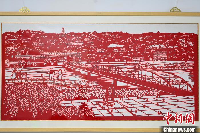 圖為展出以蘭州標(biāo)志性建筑中山橋為主題的剪紙作品。中新社記者 九美旦增 攝