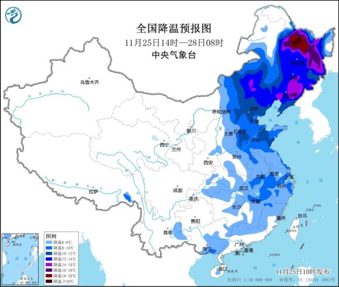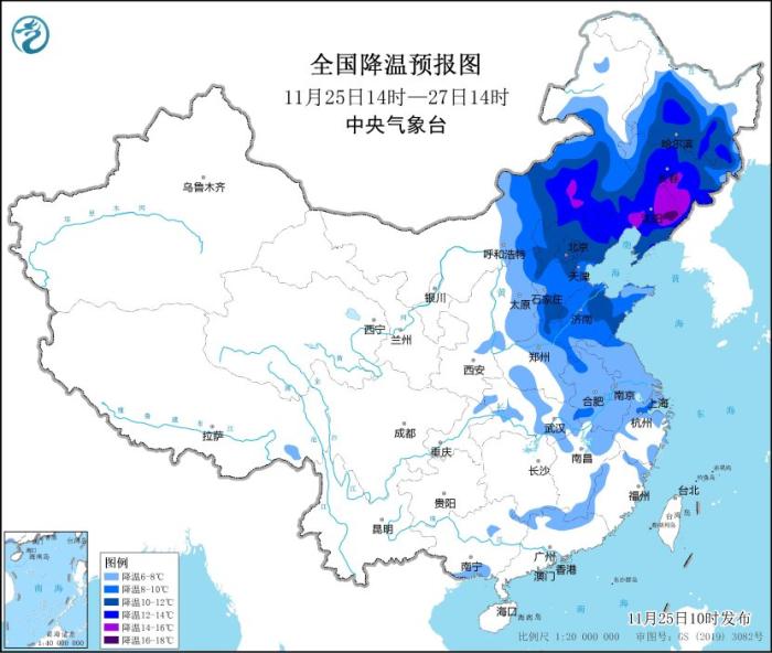 預(yù)計,11月25日14時至11月27日14時,內(nèi)蒙古中東部、華北、東北地區(qū)中南部、黃淮、江淮、江漢東部、江南北部等地將先后降溫6~10℃,其中,內(nèi)蒙古中部、華北北部、東北地區(qū)中南部等地部分地區(qū)降溫可達(dá)12℃以上。