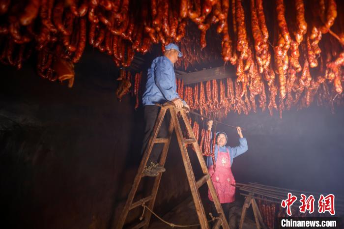 圖為貴州施秉一企業(yè)工人在下架剛熏制好的香腸。新年臨近,貴州省黔東南苗族侗族自治州施秉縣部分農(nóng)戶和企業(yè)紛紛加工趕制臘肉、香腸、血豆腐等傳統(tǒng)臘味,通過“線上+線下”銷售方式,供應(yīng)市場,喜迎新年。磨桂賓 攝