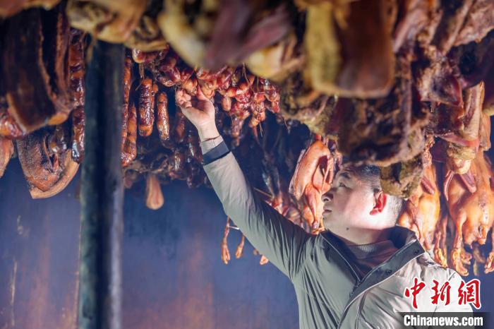 圖為貴州施秉云臺村一農(nóng)家樂業(yè)主在查看熏制臘肉、香腸的情況。磨桂賓 攝