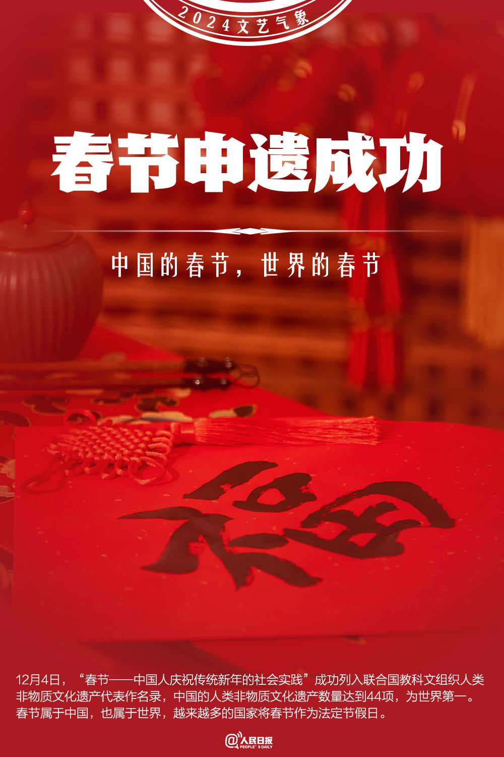 2024年7月27日,“北京中軸線——中國理想都城秩序的杰作”成功列入《世界遺產(chǎn)名錄》,中國世界遺產(chǎn)總數(shù)達到59項。12月4日,“春節(jié)——中國人慶祝傳統(tǒng)新年的社會實踐”成功列入聯(lián)合國教科文組織人類非物質(zhì)文化遺產(chǎn)代表作名錄,至此,中國共有44個項目列入聯(lián)合國教科文組織非物質(zhì)文化遺產(chǎn)名錄、名冊,總數(shù)居世界第一。