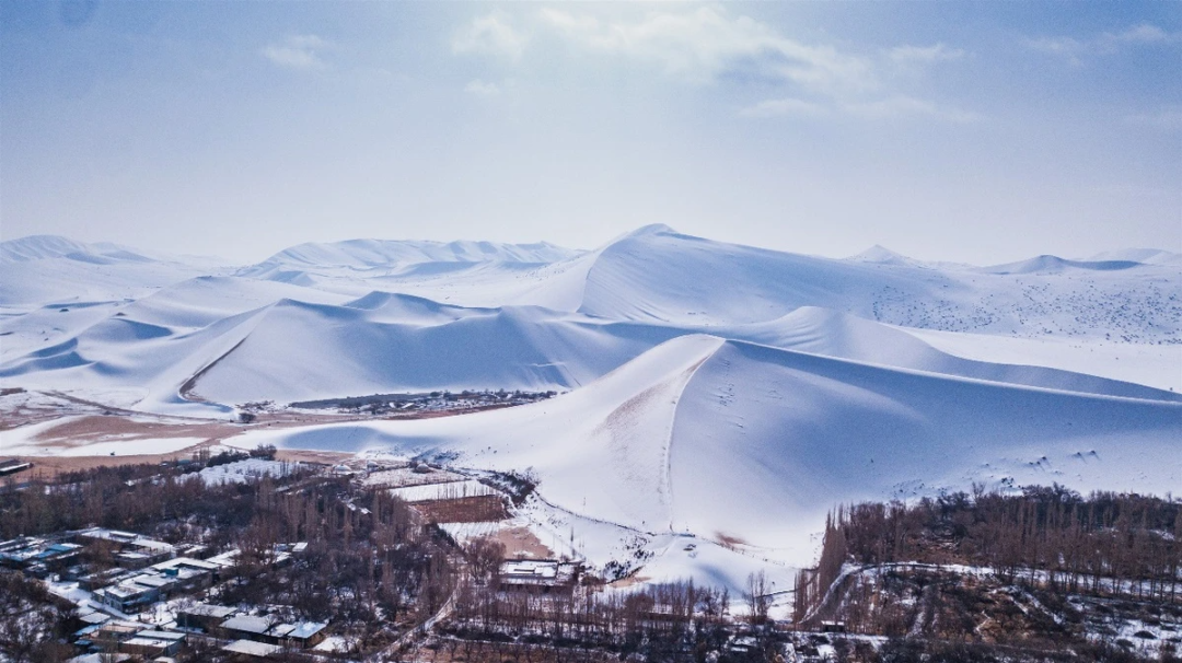 雪后的沙漠,以往那金波起伏、沙紋縱橫宛如流動(dòng)樂章的山體,此刻被厚雪溫柔掩蔽,連綿峰巒似是大地涌起的雪浪。