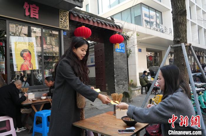 12月31日,四川成都,面館店主(左)為影迷發(fā)放自制的紀念卡片。中新社記者 安源 攝
