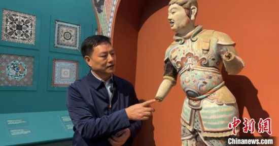 2023年2月,甘肅省蘭州市,汪萬福在敦煌藝術(shù)館向中新社記者介紹莫高窟第194窟南方增長天王塑像復制過程?!⊥跄劣?nbsp;攝