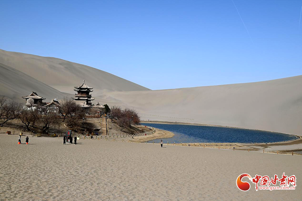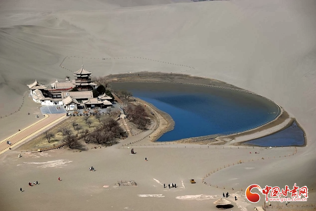 3月8日,隨著氣溫回暖,絲路明珠敦煌迎來早春勝景。鳴沙山環(huán)抱中的月牙泉冰雪消融,一泓碧水宛如翡翠鑲嵌在大漠之中,呈現(xiàn)出"沙水共生"的奇觀。