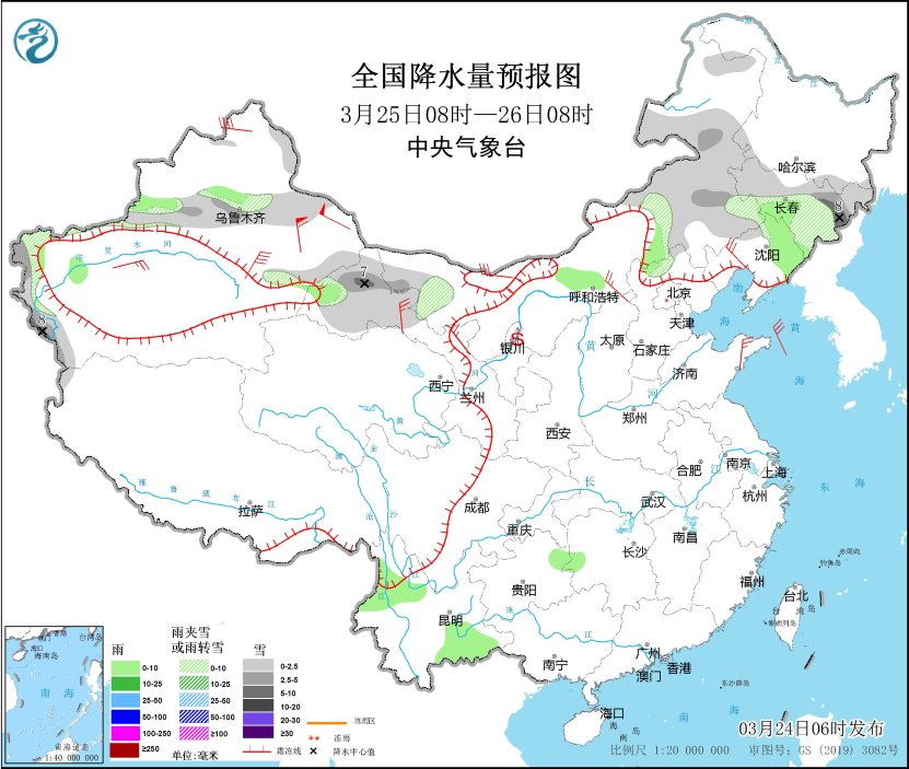 3月24日08時至25日08時,新疆北部和沿天山地區(qū)、內(nèi)蒙古東部、黑龍江西北部、吉林西北部和東部、河北北部等地部分地區(qū)有小到中雪或雨夾雪,其中,新疆阿勒泰和沿天山高海拔地區(qū)、內(nèi)蒙古東部等地部分地區(qū)有大到暴雪(10~15毫米)。新疆沿天山地區(qū)和伊犁河谷、內(nèi)蒙古東南部和西北部、遼寧北部、華北北部、西南地區(qū)南部和東部等地部分地區(qū)有小雨,其中,新疆伊犁河谷等地部分地區(qū)有中到大雨。內(nèi)蒙古中西部、山西北部、河北北部、黑龍江西部、山東半島、新疆北部等地部分地區(qū)有4~6級風(fēng)。內(nèi)蒙古西部、寧夏北部等地部分地區(qū)有揚沙或浮塵,局地有沙塵暴。