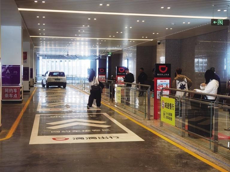 3月25日下午2時許,記者實地探訪了中川機場新投用的網(wǎng)約車上客區(qū)。記者從T3航站樓國內(nèi)到達出口循著滴滴App上的線上步行引導卡以及線下的指引牌,穿過連廊,便抵達網(wǎng)約車專屬候車區(qū)。若從中川機場東站出發(fā),乘坐扶梯或直梯到達T3航站樓2F綜合交通樞紐,穿過連廊,也可完成從航站樓到上車點的無縫銜接。