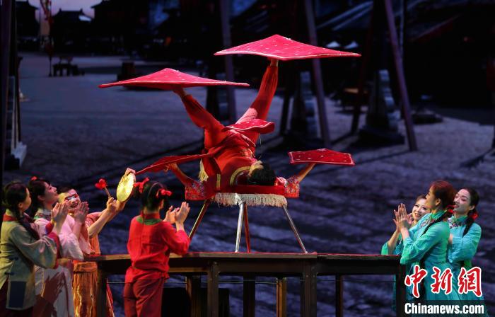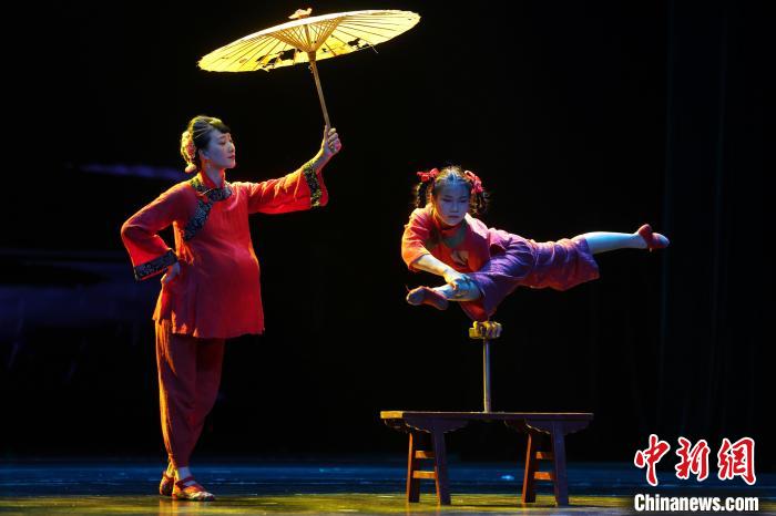 圖為飾演雜技班師娘的演員正在表演。中新社記者 劉占昆 攝