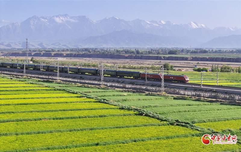 近日,祁連山下的民樂縣三堡鎮(zhèn)徐寨村的油菜花競相綻放,與通村公路、鄉(xiāng)村民居和行駛的火車交相輝映,構成一幅美麗的鄉(xiāng)村田園美景。