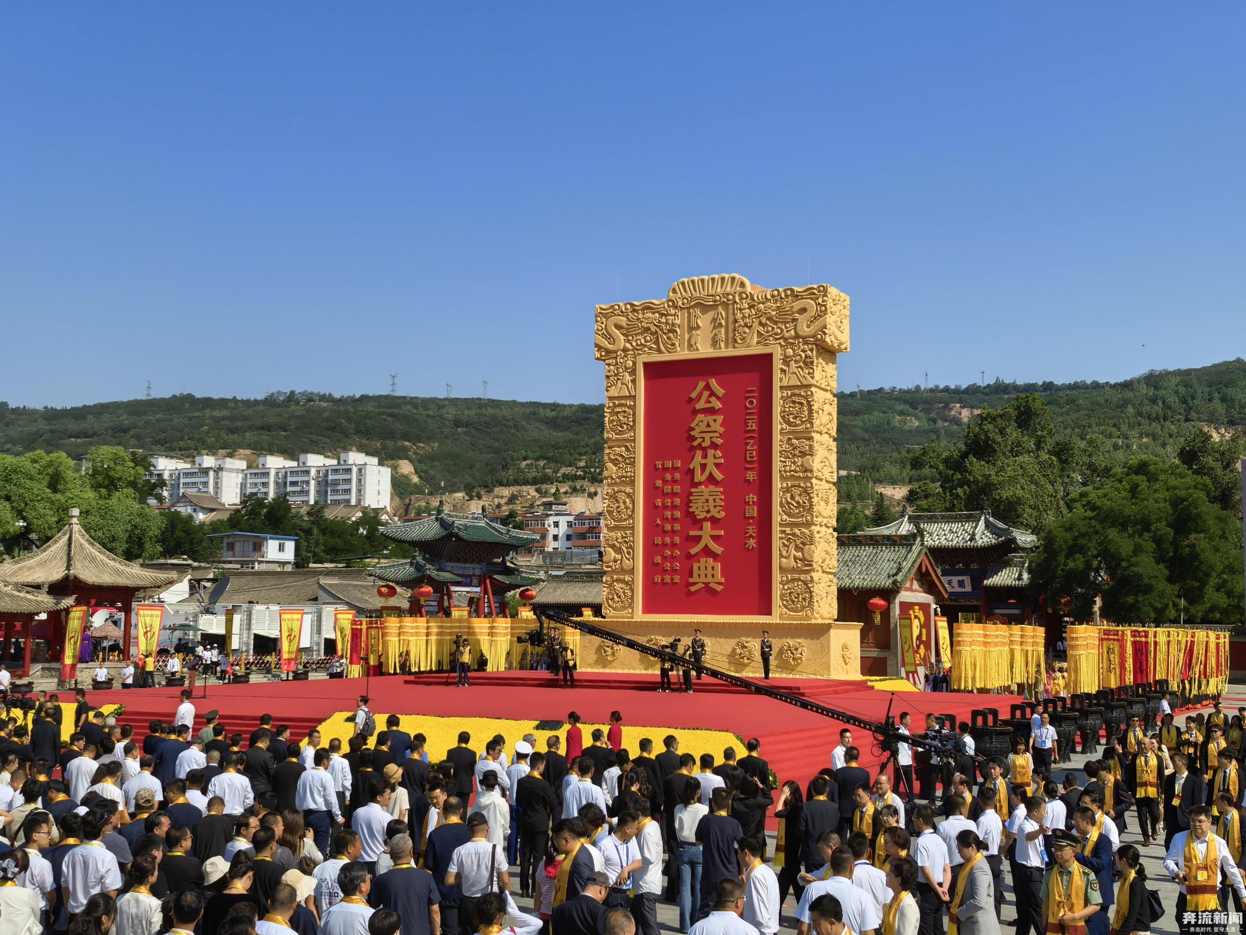 上午9時50分,天水伏羲廣場黃鐘大呂齊鳴,公祭伏羲大典正式拉開帷幕。大典包括擊鼓鳴鐘、恭讀祭文、鞠躬敬祭、樂舞告祭、敬獻花籃及謁廟拜祖六項儀程。