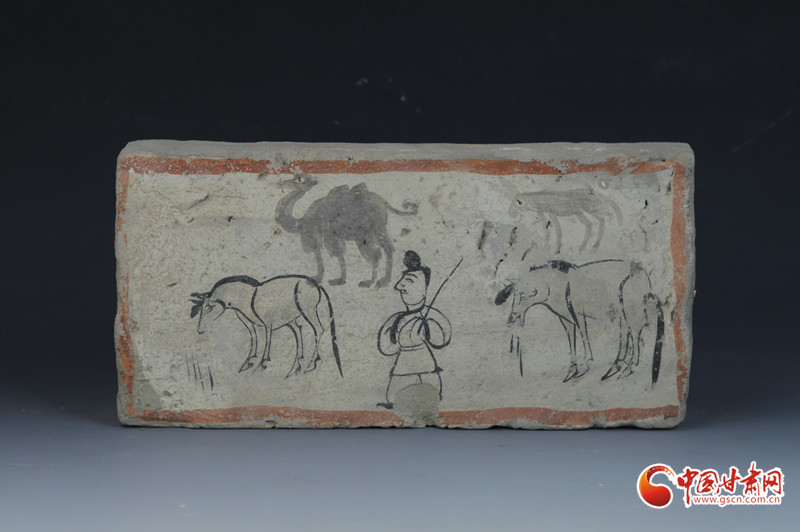 “這件壁畫磚之所以在美術(shù)界聲名鵲起,關(guān)鍵在于其獨(dú)特的表現(xiàn)手法——同時(shí)運(yùn)用了美術(shù)中的兩種繪畫技法。一方面,它采用白描手法,以墨勾勒形象,借鑒‘白畫’之精髓而發(fā)展出新的畫法。這種畫法具有單純洗練、樸素典雅的風(fēng)格特征,展現(xiàn)了筆墨線條本身的豐富表現(xiàn)力。”高臺(tái)縣博物館副館長(zhǎng)孫麗娟介紹,在《牧馬、駱駝圖壁畫磚》上,可以清晰地看到以線條直接勾勒出的近處馬的形象,線條流暢且精準(zhǔn),將馬的形態(tài)栩栩如生地展現(xiàn)出來(lái)。