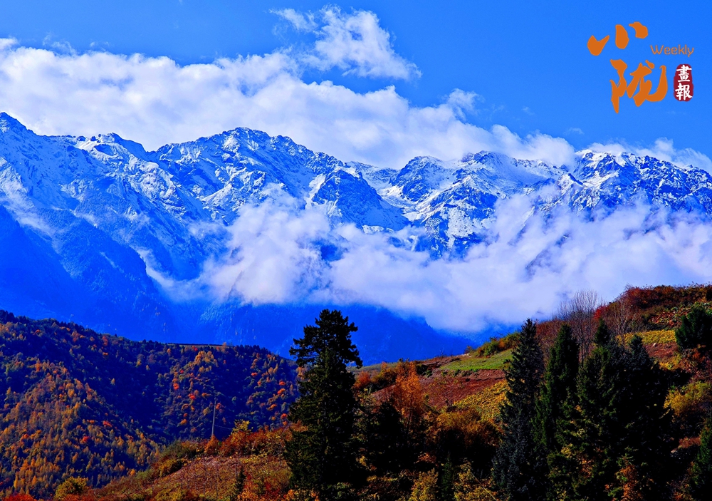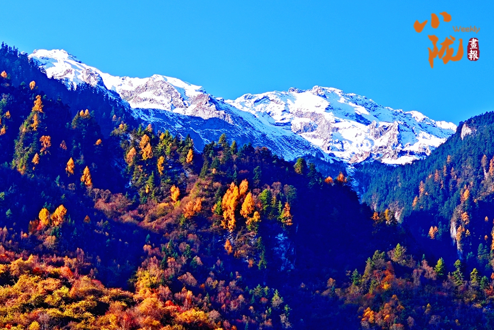 山巔的白雪與彩林形成鮮明對比,紅與黃,白與藍,在陽光的映照下,共同編織出一幅溫柔而夢幻的畫卷。